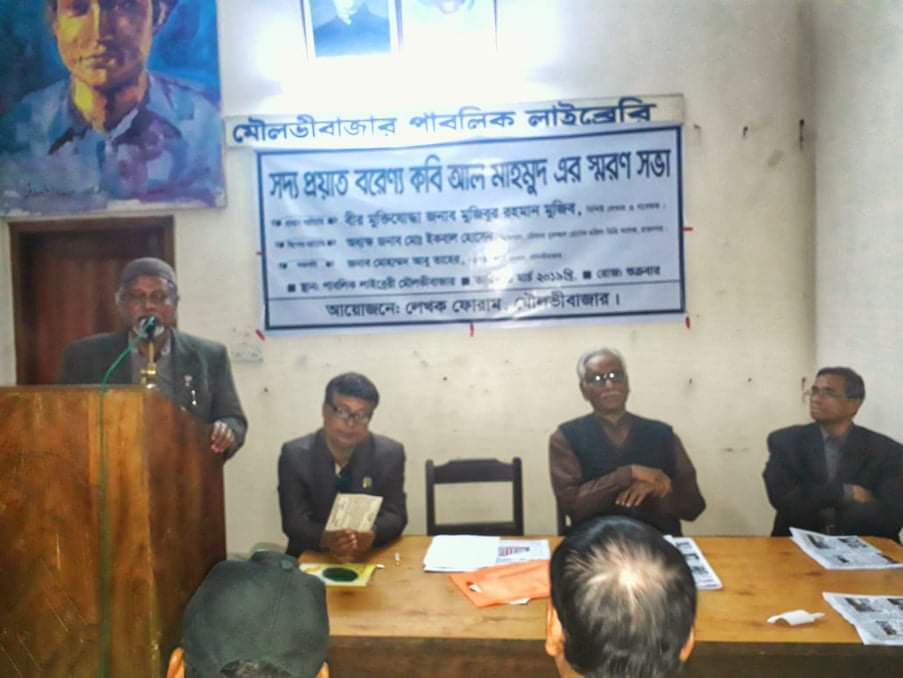 কাইয়ুম সুলতান :  বাংলা সাহিত্যের শক্তিমান কবি আল মাহমুদের মৃত্যুতে লেখক ফোরাম মৌলভীবাজার জেলা পাবলিক লাইব্রেরী মিলনায়তনে পহেলা মার্চ বিকাল ৪ ঘটিকায় এক স্বরণসভার আয়োজন করে। লেখক ফোরাম মৌলভীবাজারের সভাপতি মোঃ আবূ তাহের এর সভাপতিত্বে ও সাধারণ সম্পাদক দীপ্তেন্দু দাশগুপ্ত কাজল এর সঞ্চালনায় স্বরণসভায় প্রধান অতিথি হিসেবে উপস্থিত ছিলেন বিশিষ্ট প্রাবন্ধিক, গবেষক ও মুক্তিযোদ্ধা এ্যাডভোকেট মুজিবুর রহমান মুজিব । বিশেষ অতিথি হিসেবে উপস্থিত ছিলেন মৌলভীবাজার সরকারি মহিলা কলেজের সাবেক অধ্যক্ষ অধ্যাপক মোহাম্মদ শাহজাহান, মৌলভীবাজার জেলা সাংবাদিক ফোরামের সভাপতি ও দৈনিক বাংলার দিন সম্পাদক বকশি ইকবাল আহমদ। এছাড়া বক্তব্য রাখেন বিশিষ্ট নাট্যকার ও মৌলভীবাজার সরকারি কলেজের সাবেক ভি পি মোঃ আব্দুল মতিন, রেড ক্রিসেন্ট সোসাইটি মৌলভীবাজারের সাবেক সেক্রেটারী এম শাহাবুদ্দিন আহমদ, অ্যাডভোকেট মাহবুবুল আলম রুহেল, সাপ্তাহিক দেশপক্ষের বার্তা সম্পাদক বেলাল তালুকদার, বোরহান উদ্দিন(রঃ) ইসলামী সোসাইটির সভাপতি এম মুহিবুর রহমান মুহিব, কবি পুলক কান্তি ধর, এ্যাডভোকেট হাফিজ আব্দুল আলিম, সাংবাদিক দুরুদ আহমদ, এহসান বিন মুজাহির, আবুল কালাম আজাদ, এম এ সামাদ প্রমুখ।
