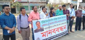 ১৬ মার্চ সোমবার সকাল ১১ ঘটিকায় শাখা সভাপতি বেলাল তালুকদার এর সভাপতিত্বে ও যুগ্ম সাধারণ সম্পাদক এম এ কাইয়ুম সুলতানের সঞ্চালনায় প্রেসক্লাবের সামনে আয়োজিত এ মানববন্ধন ও বিক্ষোভ সমাবেশে প্রধান অতিথি হিসেবে উপস্থিত ছিলেন মৌলভীবাজার প্রেসক্লাবের সাবেক সভাপতি ও দৈনিক বাংলার দিন পত্রিকার সম্পাদক বকশি ইকবাল আহমেদ।